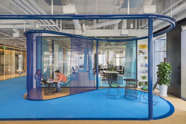 本案是旅游公司的辦公室裝修設計,室內空間更偏向于年輕而新興,整個空間都是海藍色,為了讓這種視覺淋漓盡致的呈現,深藍色的高架管道沿著大廳周圍循環(huán),劃分了大廳區(qū)域內不同的小區(qū)域,地毯的顏色和海浪般的邊緣看起來像海面,透明的玻璃材質則像是陽光,可以反射進深處的空間,所以在光線上起到了輔助效果。