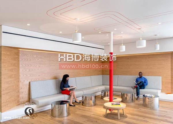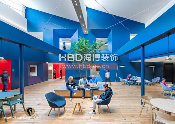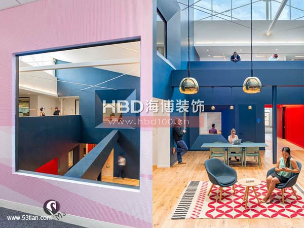接下來廣州裝修公司海博裝飾小編帶你來看一組國(guó)外辦公室裝修純色劃分空間設(shè)計(jì)的案例,通過純凈的色彩來進(jìn)行空間隔斷,劃分出不同的功能區(qū)域。如下圖的辦公空間,藍(lán)色是各個(gè)部門的會(huì)客區(qū)、紅色區(qū)域設(shè)計(jì)為休息兼走廊、灰色與白色區(qū)域?yàn)楣ぷ鲄^(qū)域。整個(gè)空間使用顏色劃分區(qū)域來看,工作區(qū)顯得更為常態(tài),而展示給客戶的區(qū)域在用色上更為大膽。